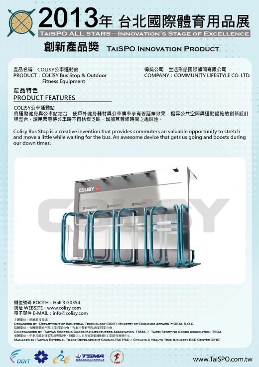 Progress takes time. Excellence takes courage.【Colisy Bus Stop & Outdoor Fitness Equipment】won 2013 TaiSPO All Stars—Innovation’s Stage of Excellence Competition.
